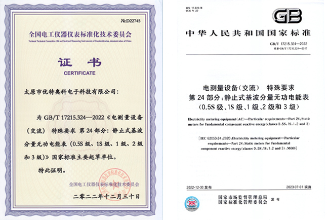 優(yōu)特奧科作為主要起草單位的國家標(biāo)準(zhǔn)《GB/T17215.324-2022電測量設(shè)備(交流)特殊要求 第24部分:靜止式基波分量無功電能表(0.5S級、1S級、1級、2級和3級)》于2022年12月30日發(fā)布,2023年7月1日實施。